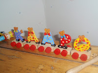 Oottekos muuten nähneet tällaisia kirjaimia? Niitä on erilaisia ja niistä tulee puujuna, jolla voi huristella. Minä en ollut nähnyt, tosinen en oo pikkulastenjuttuja seurannut moneen vuoteen. Ei tule kaverilla vastaan, ellei ole samanniminen:)